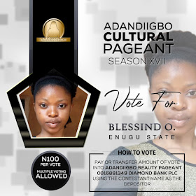 A MODERN DAY EFFORT TO REVIVE THE PROUD CULTURAL HERITAGE OF NOT JUST THE IGBOS BUT NIGERIANS BOTH AT HOME & IN DIASPORA.A NON SWIM WEAR EVENT.IT IS THE PRESERVATION OF OUR CULTURAL VALUES .FORMS ARE AVAILABLE ANNUALLY AT ADANDIIGBO OFFICE,22 EDE STREET OGBUNABALI P.H. ALL REGISTRATIONS WORLDWIDE FOR SEASON 21 AT FACEBOOK.COM\ADANDIIGBO II SEND MESSGGES FROM JUNE 30,2025 PAYMENTS TO ACCESS BANK (ADANDIIGBO BEAUTY PAGEANT)0016891349 SMS TELLER NUMBER TO 08063939351